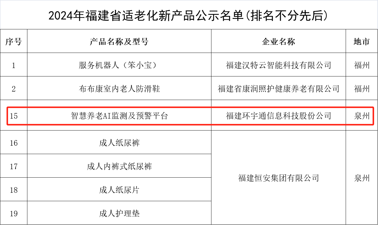 2024年11月19日,2024年福建省適老化新產(chǎn)品公示名單公布,全省有24款產(chǎn)品位列名單,泉州共有五款產(chǎn)品入選。其中環(huán)宇通依托技術(shù)積累和創(chuàng)新能力所推出的“智慧養(yǎng)老AI監(jiān)測及預(yù)警平臺”入選該名單。這一榮譽(yù)不僅是對公司在“AI+醫(yī)療康養(yǎng)”領(lǐng)域的長期努力和貢獻(xiàn)的肯定,更是對未來持續(xù)創(chuàng)新與高質(zhì)量發(fā)展的激勵。